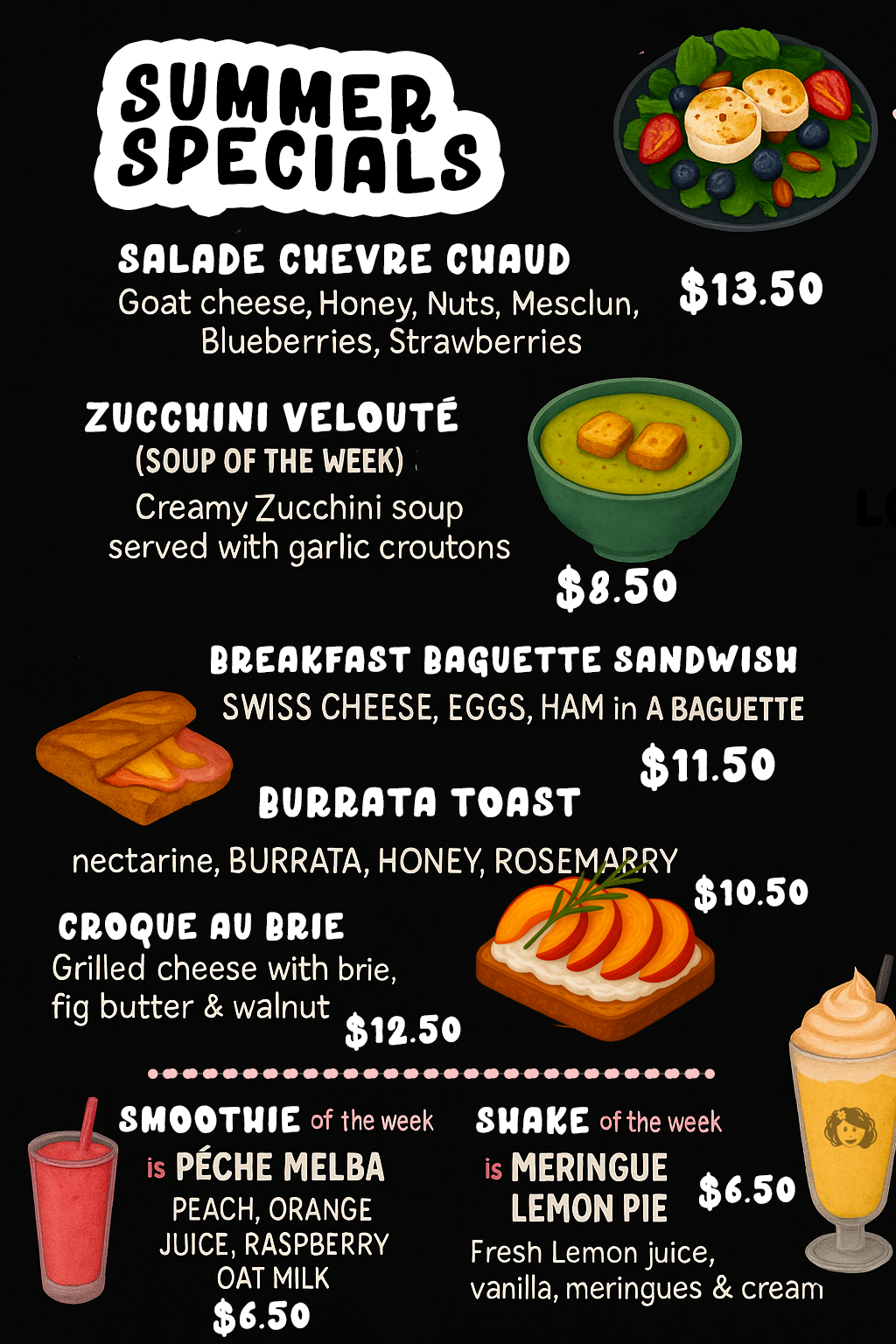 Her favorite menu items are the Pan Bagnat, Nutella Muffin, and the Madeleines.
